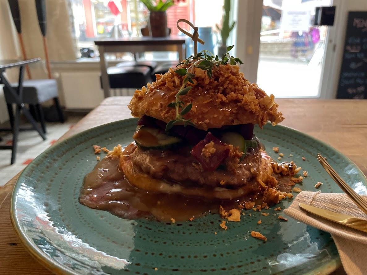 Hjemmelavet 220 gram bøfsandwich med det hele og meget sauce hertil grove fritter samt Aio li