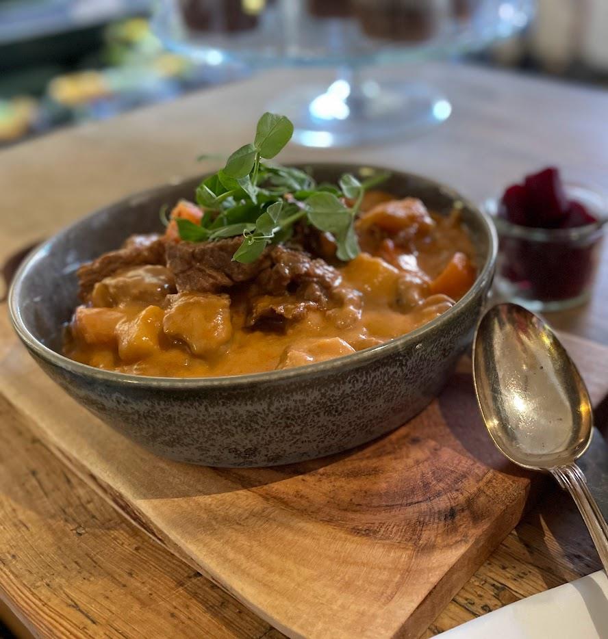 Gryderet med oksekød-kikærter og grønt hertil kartofler, salat og brød