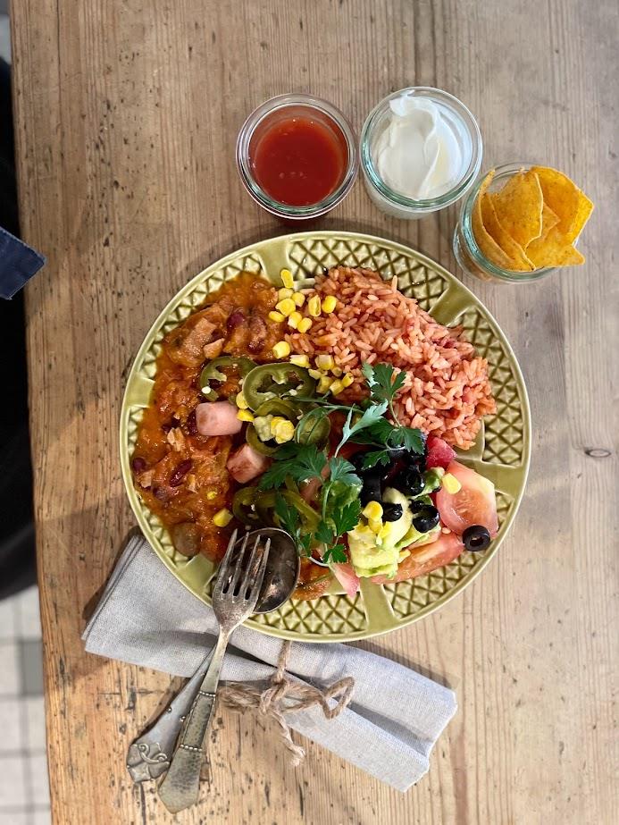 Chili con carne hertil ris, salat, chips og brød