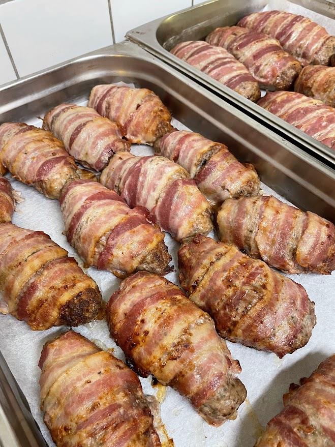 Farsbrød med bacon hertil stegte løg, kartofler og broccolisalat