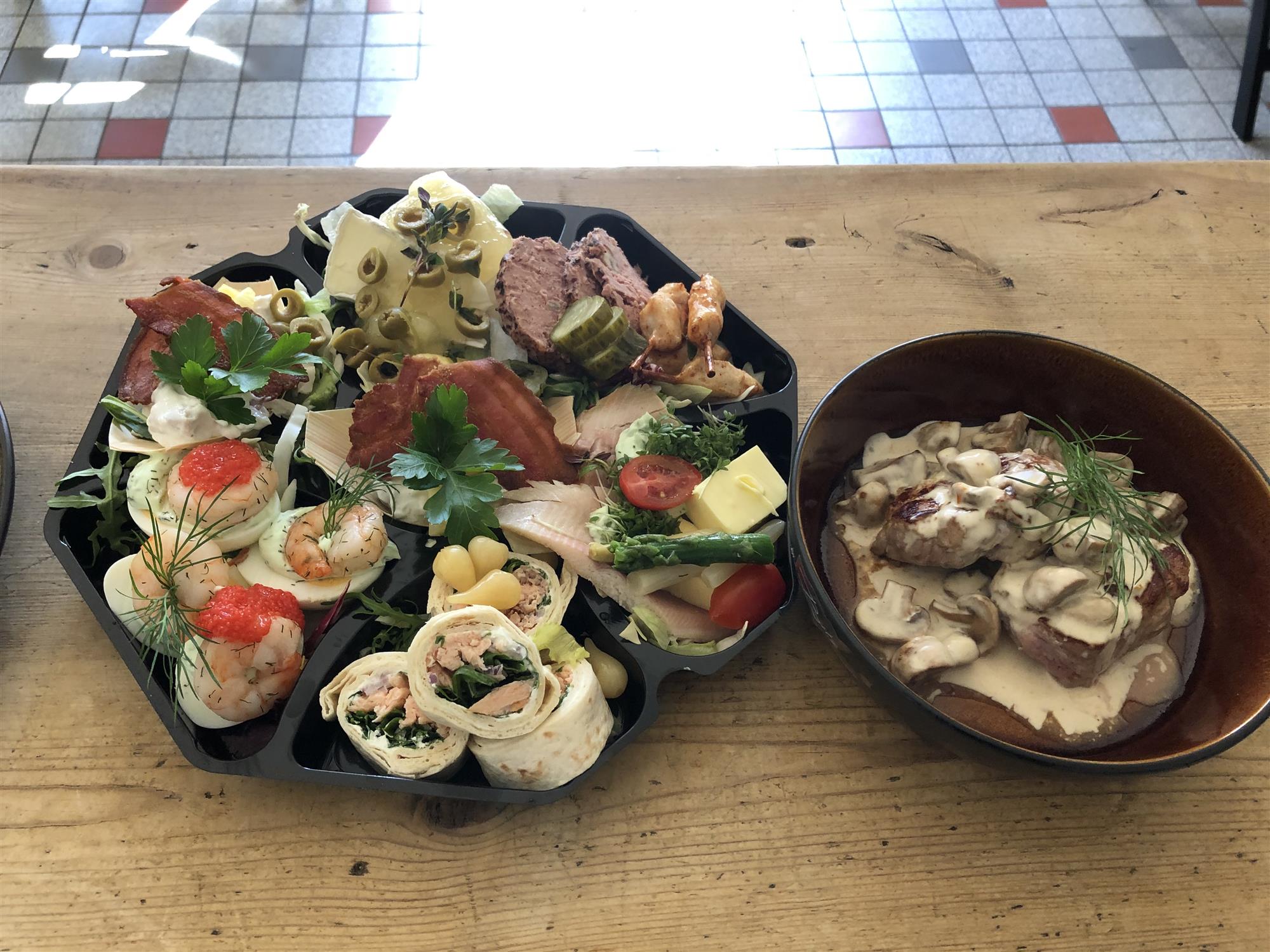 8 kolde + 1 lun serveringer Bakke til 1 eller 2 personer Wraps med laks og flødeost Røget ørredefilet citron mayo, asparges og pynt ½ æg med rejer, kaviar og dildmayonnaise Hjemmelavet hønsesalat a la Helle pynt af ananas og bacon Marineret mini kyllingespyd Fransk pate hertil syltede løg og Cornichoner Spansk pølse og oliven Brieost med æblekompot (lun selv) Saltbagt kartofler Mørbrad i svampecremeHjemmebagt brød aio li pris pr. person